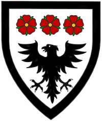 Argent, an eagle sable and in chief three roses proper, a bordure sable.