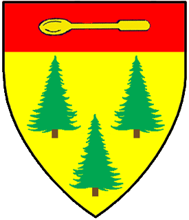 <small>[http://heraldry.avacal.org/rollofarms/display.php?id=823 Or, three pine trees couped proper and on a chief gules a spoon fesswise Or]</small>