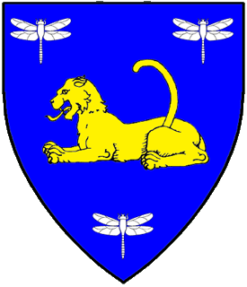 Azure, a cat couchant Or between three dragonflies argent. Registered as Dýrfinna Wanderer |